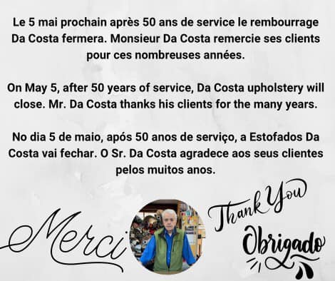 À compter du 5 mai 2023, le Rembourrage da Costa cesse ses activités.